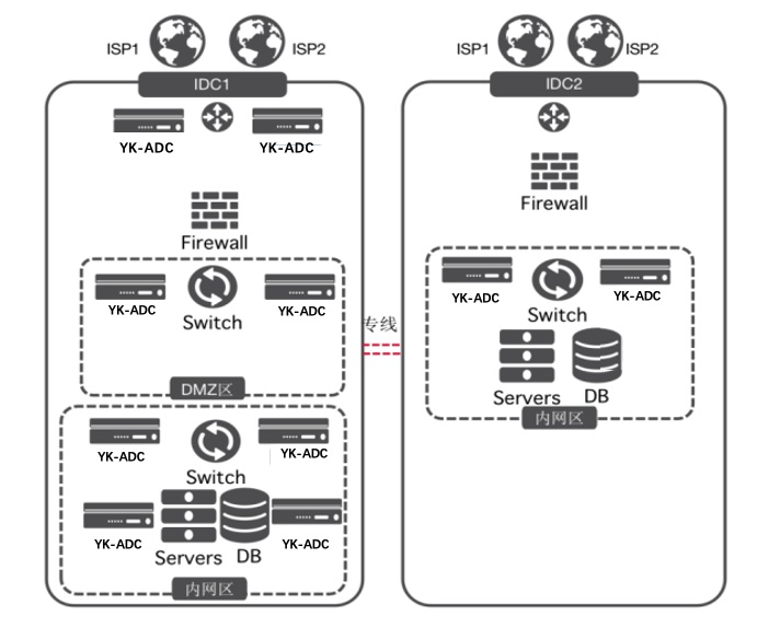 3、內(nèi)網(wǎng)采用YK-ADC的RHI+OSPF和集群技術(shù),做到IP架構(gòu)的雙中心雙活應用調(diào)度
