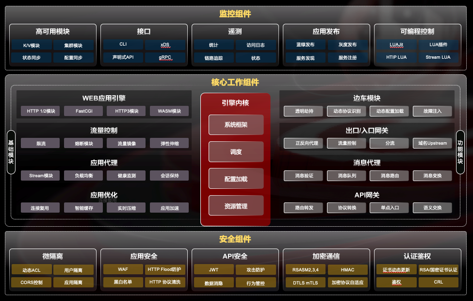 OpenNJet是以NGINX1.23.1開源版本為基礎,派生并獨立演進的云原生應用引擎,進行內(nèi)核重構、安全加固、功能增強開發(fā),并隨著NGINX版本迭代,吸收上游NGINX的更新,還提供了服務網(wǎng)格中東西向通信、透明流量劫持、熔斷、遙測與故障注入、鏈路追蹤、藍綠發(fā)布等新功能特性。