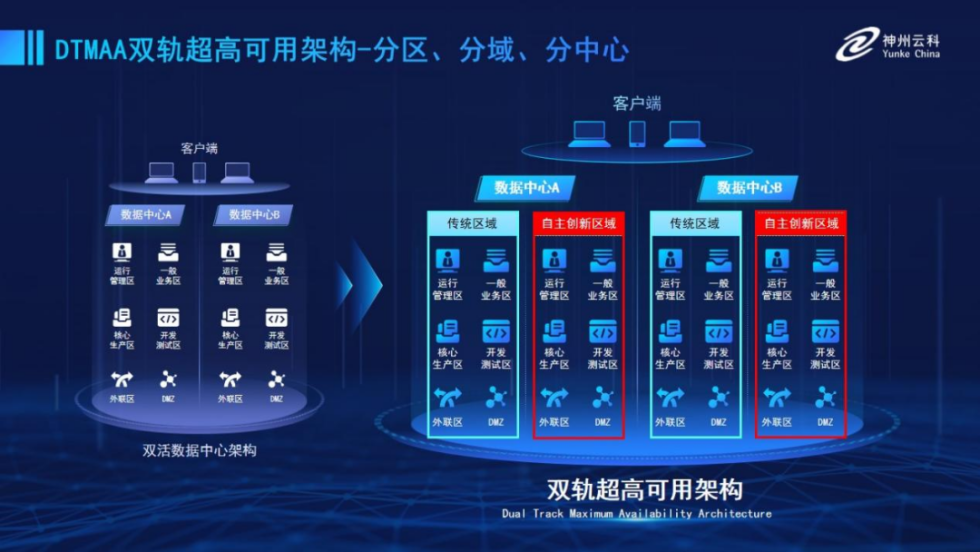 為幫助金融客戶更好地應對數字經濟時代對可持續(xù)性的高要求,實現“信創(chuàng)”與“數字化”齊頭并進,leyu.樂魚推出了雙軌超高可用架構。該架構在雙活數據中心的分區(qū)調度基礎上,增加信創(chuàng)域和非信創(chuàng)域的分域調度,實行信創(chuàng)域與傳統(tǒng)域應用全量部署,使雙中心運營變?yōu)殡p中心四區(qū)域并行運行,互為多活,將“0到1”的單軌建設道路變?yōu)榉謪^(qū)分域協同的多活雙軌超高可用架構。幫助客戶在新架構下,保障“信創(chuàng)”的同時解決性能瓶頸,提升穩(wěn)定性,保證應用可持續(xù)性,最終實現信創(chuàng)區(qū)域和非信創(chuàng)區(qū)域的平滑過渡,完成國產化替代目標。