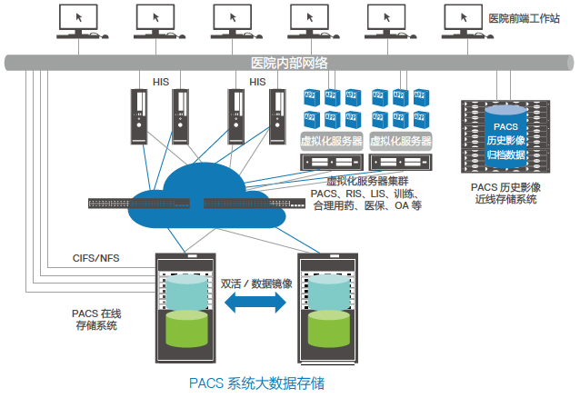高速調用影像:采用 SAN+NAS 存儲作為核心存儲,存儲 PACS 系統(tǒng)數(shù)據(jù)庫和在線的 PACS影像文件,提供高速的數(shù)據(jù)訪問能力;